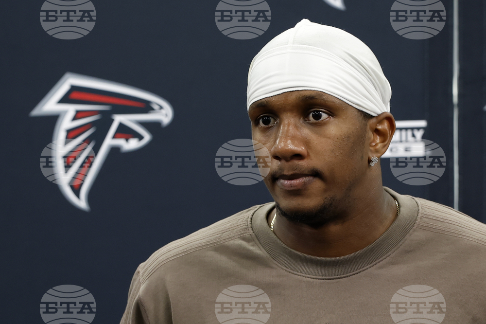 Atlanta Falcons quarterback Michael Penix Jr. speaks during a news conference after an NFL football game against the Carolina Panthers, Sunday, Sept. 21, 2025, in Charlotte, N.C. (AP Photo/Rusty Jones)