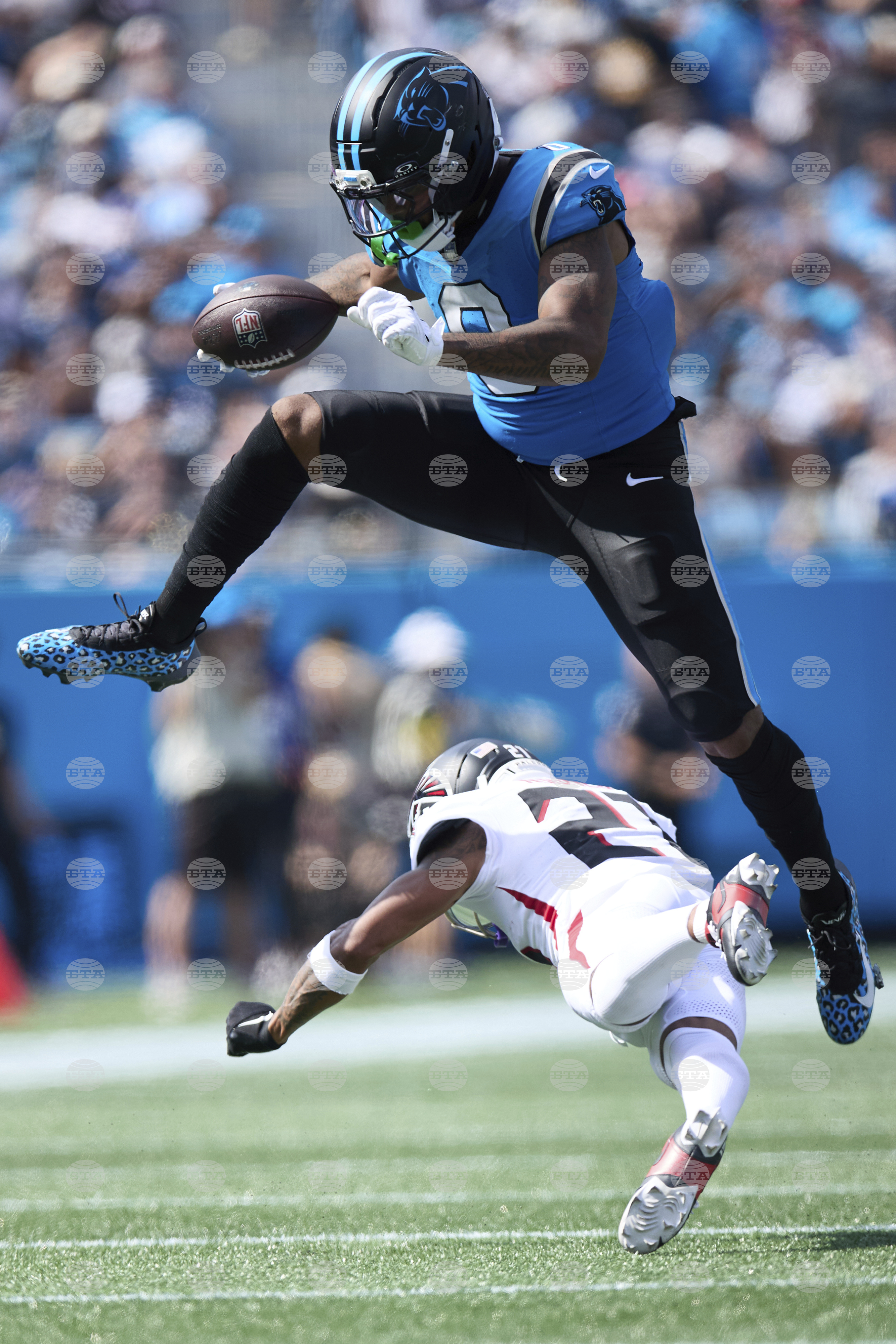 Carolina Panthers tight end Ja'Tavion Sanders (0) leaps over Atlanta Falcons cornerback Mike Hughes (21) during an NFL football game, Sunday Sep. 21, 2025, in Charlotte, N.C. (AP Photo/Brian Westerholt)