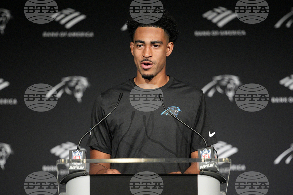 Carolina Panthers quarterback Bryce Young speaks during a news conference after an NFL football game against the Atlanta Falcons, Sunday, Sept. 21, 2025, in Charlotte, N.C. (AP Photo/Jacob Kupferman)