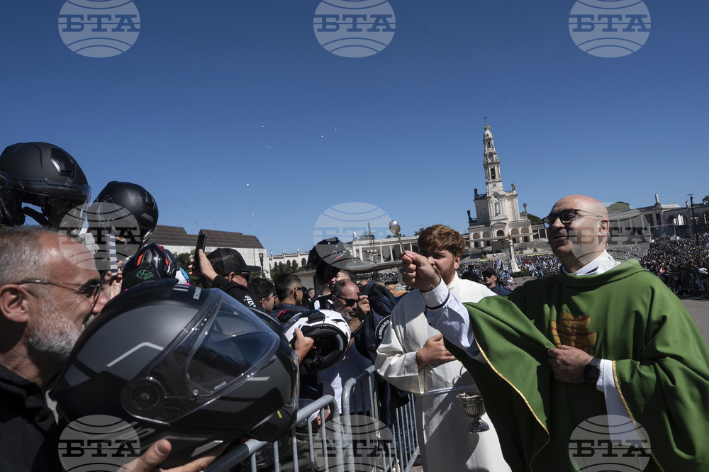 Motorcyclists attend mass at the Roman Catholic holy shrine of Fatima, during the 10th Pilgrimage of the Blessing of Helmets that draws tens of thousands, in Fatima, Portugal, Sunday, Sept. 21, 2025. (AP Photo/Ana Brigida)