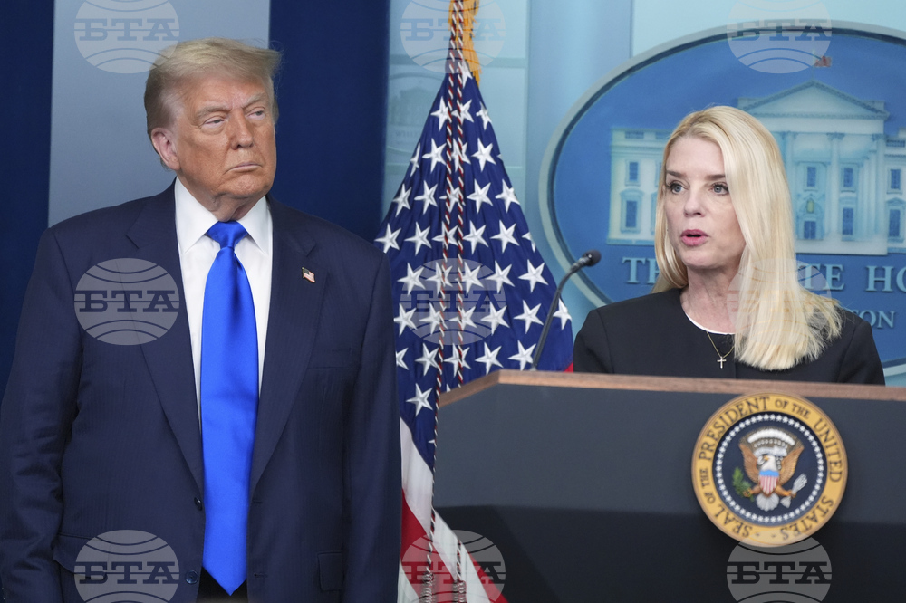 FILE - Attorney General Pam Bondi speaks to reporters as President Donald Trump listens, Friday, June 27, 2025, in the briefing room of the White House in Washington. (AP Photo/Jacquelyn Martin, File)