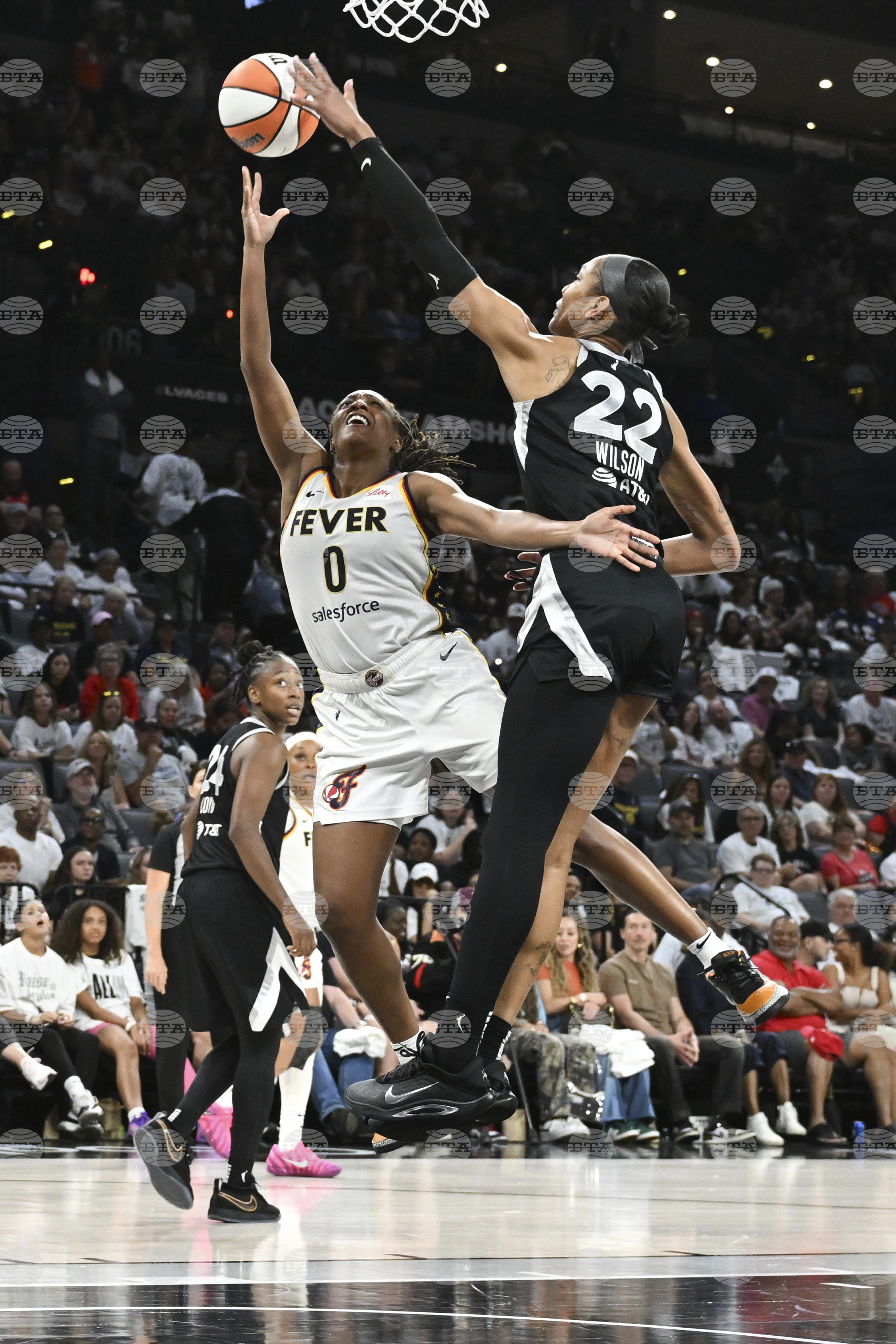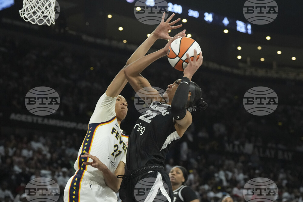 Las Vegas Aces center A'ja Wilson (22) looks to shoot against Indiana Fever forward Makayla Timpson, left, in the first half of Game 1 of a WNBA basketball playoff semifinals series Sunday, Sept. 21, 2025, in Las Vegas. (AP Photo/Candice Ward)