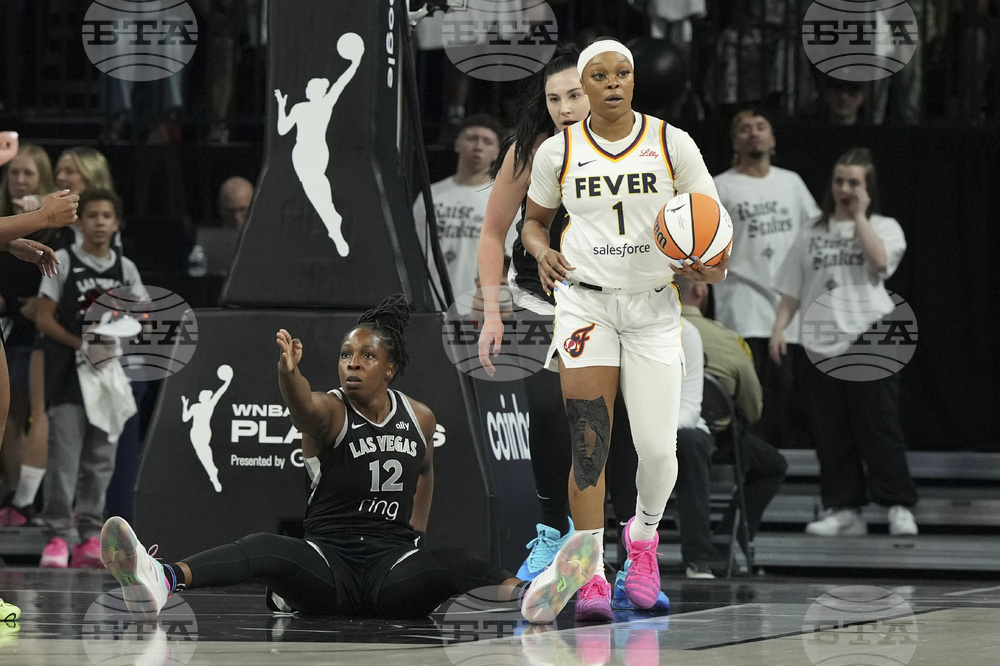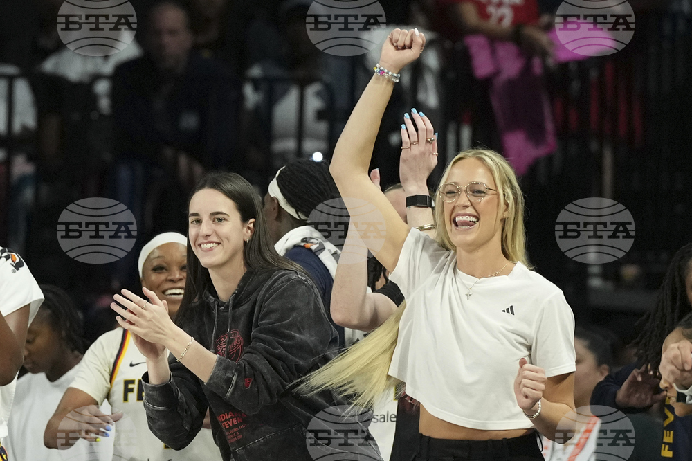 Indiana Fever guards Caitlin Clark, front left, and Sophie Cunningham, right, celebrate from the bench after a play in the second half of Game 1 against the Las Vegas Aces in a WNBA basketball playoff semifinals series Sunday, Sept. 21, 2025, in Las Vegas. (AP Photo/Candice Ward)