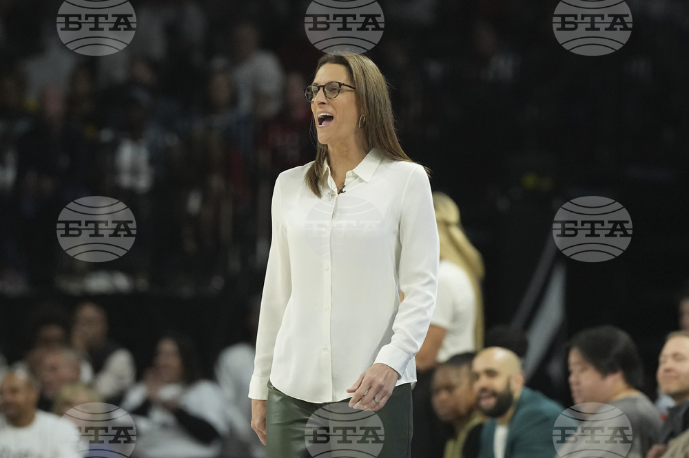 Las Vegas Aces head coach Becky Hammon looks on in the second half of Game 1 against the Indiana Fever in a WNBA basketball playoff semifinals Sunday, Sept. 21, 2025, in Las Vegas. (AP Photo/Candice Ward)