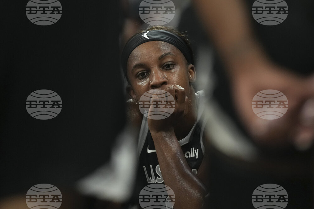 From left to right, head of WNBA league operations Bethany Donaphin, KIA representative Eric Watson, Las Vegas Aces center A'ja Wilson and Aces president Nikki Fargas pose during the 2025 WNBA Most Valuable Player award presentation to Wilson before Game 1 of a WNBA basketball playoff semifinals series Sunday, Sept. 21, 2025, in Las Vegas. (AP Photo/Candice Ward)