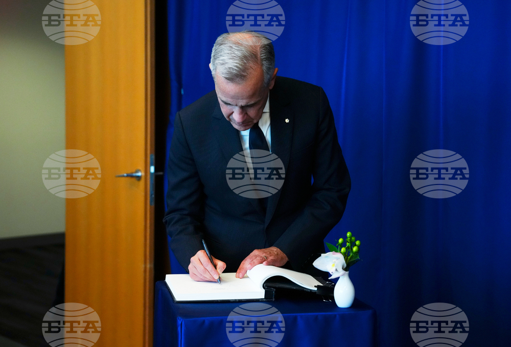 Canada's Prime Minister Mark Carney signs a guest book as he meets with Antonio Guterres, Secretary-General of the United Nations, in the Secretariat Building at United Nations Headquarters, Sunday, Sept. 21, 2025. (Sean Kilpatrick/The Canadian Press via AP)