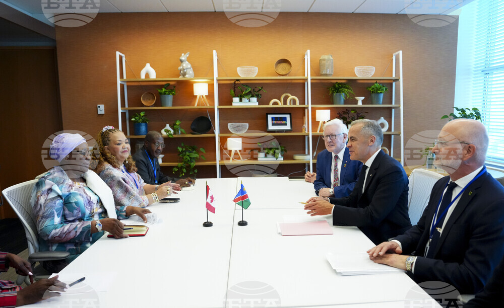 Canada's Prime Minister Mark Carney, second from right, takes part in a bilateral meeting with Namibia's President Netumbo Nandi-Ndaitwah, left, at the United Nations Headquarters, Sunday, Sept. 21, 2025. (Sean Kilpatrick/The Canadian Press via AP)