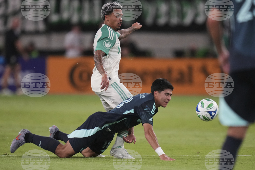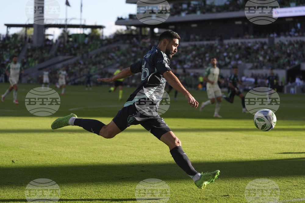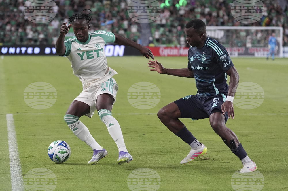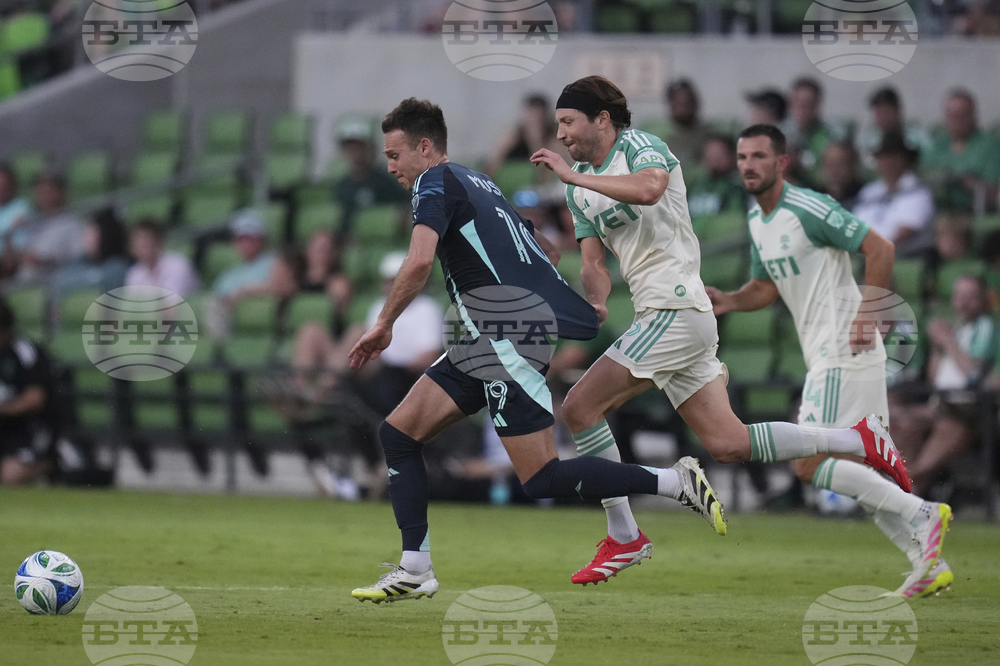 Seattle Sounders' Obed Vargas, center, kicks the ball past Austin FC's Owen Wolff (33) during the second half of an MLS soccer match in Austin, Texas, Sunday, Sept. 21, 2025. (AP Photo/Eric Gay)