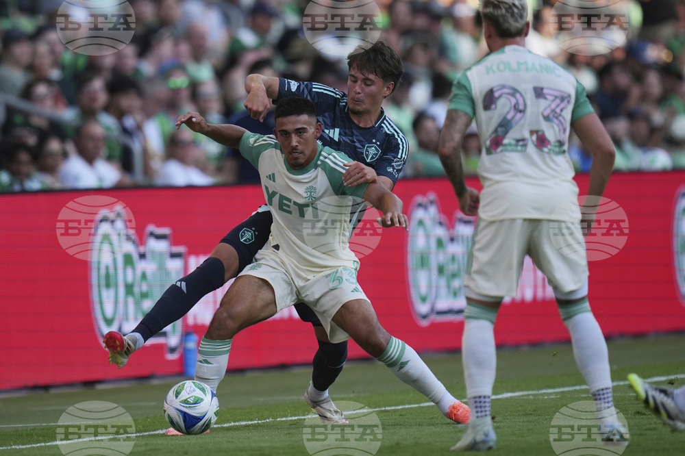 Austin FC's Owen Wolff (33) and Seattle Sounders' Danny Musovski (19) collide as they battle for control of the ball during the first half of an MLS soccer match in Austin, Texas, Sunday, Sept. 21, 2025. (AP Photo/Eric Gay)