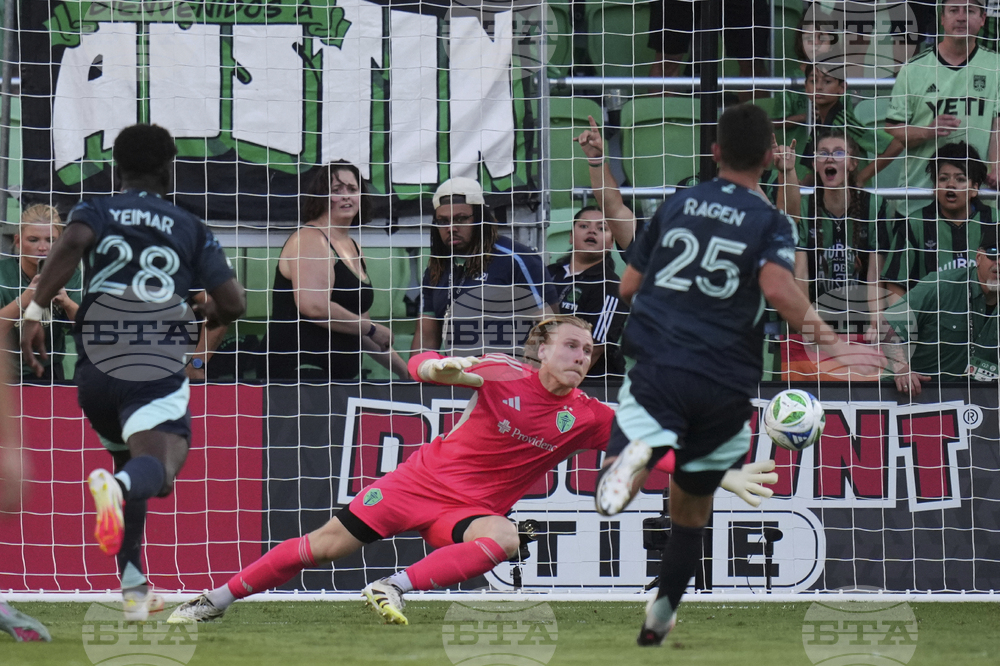 Seattle Sounders usa Andrew Thomas (26) can't block the ball as Austin FC scores during the first half of an MLS soccer match in Austin, Texas, Sunday, Sept. 21, 2025. (AP Photo/Eric Gay)