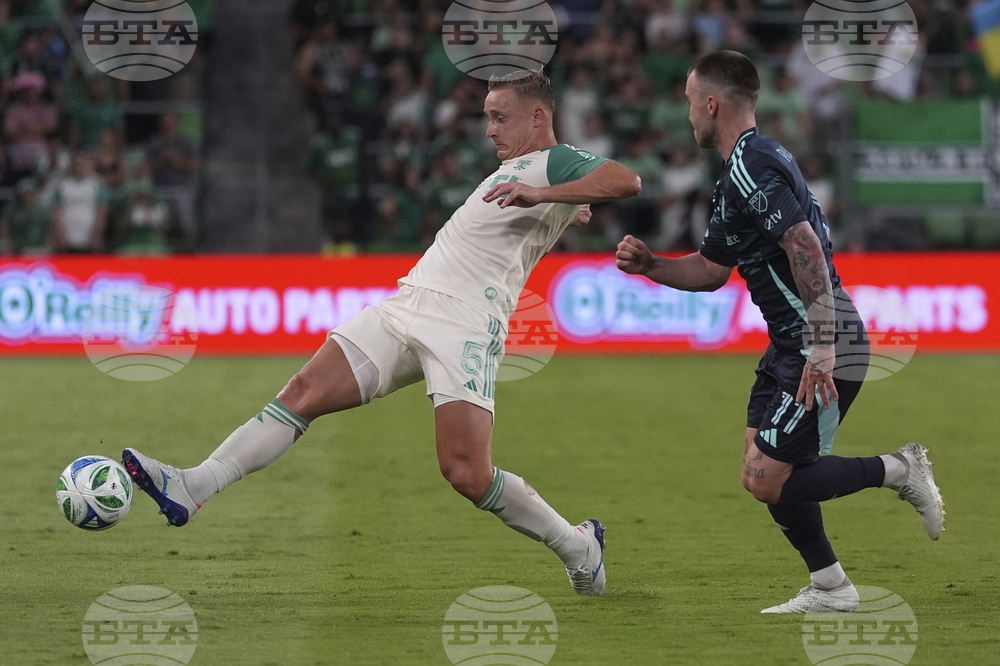 Austin FC defender Marius Hoibraten (5) moves the ball past Seattle Sounders' Albert Rusnak (11) during the second half of an MLS soccer match in Austin, Texas, Sunday, Sept. 21, 2025. (AP Photo/Eric Gay)