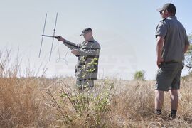 Marais Fuls, left, a wildlife monitor, holds an antenna to locate rhinos at the Dinokeng Game Reserve near Hammanskraal, South Africa, Thursday, Sept. 18, 2025. (AP Photo/Alfonso Nqunjana)
