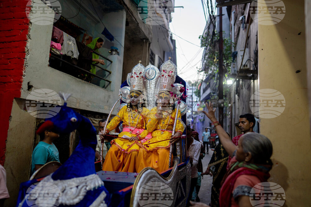 Indian Hindu devotees offer flowers to artists dressed as Hindu deities Rama, left, and Lakshman, sitting on a chariot pulled by laborers ahead of a religious procession during the Dussehra festival, known as Vijayadashami, the day Rama killed demon king Ravana who had abducted Rama's wife Sita, in the northern Indian state of Uttar Pradesh, India, Monday, Sept. 22, 2025. (AP Photo/Rajesh Kumar Singh)
