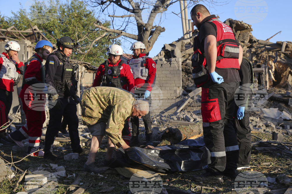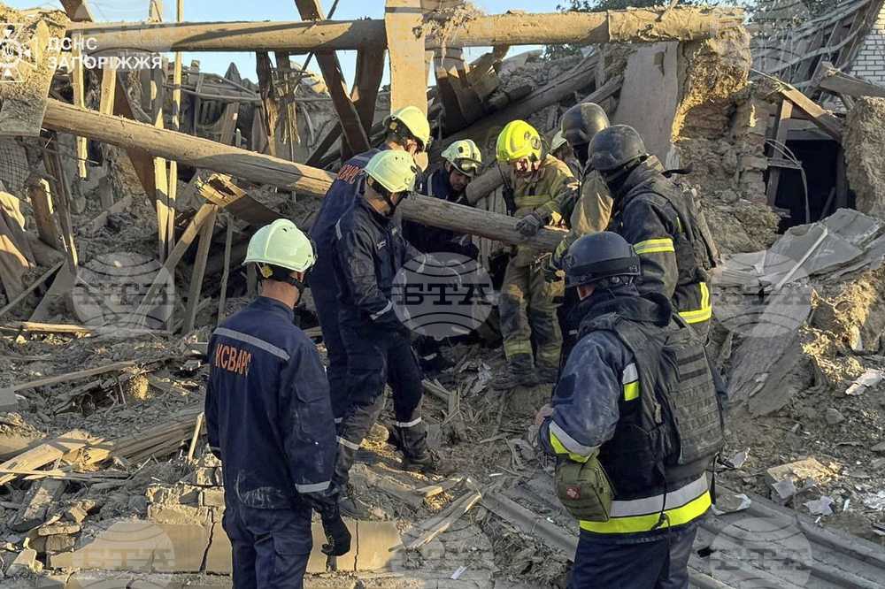 Rescuers work at a building destroyed during a Russian strike in Zaporizhzhia, Ukraine, Monday, Sept. 22, 2025. (AP Photo/Kateryna Klochko)