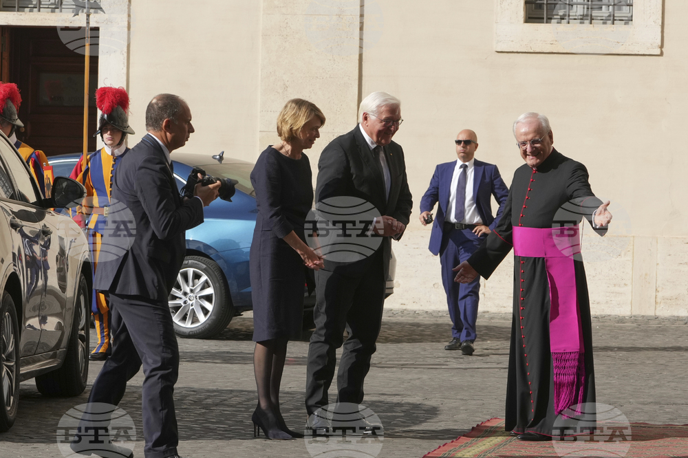 German President Frank-Walter Steinmeier and his wife Elke Buedenbender arrive at the St. Damaso courtyard ahead of his private audience with Pope Leo XIV at the Vatican, Monday, Sept. 22, 2025. (AP Photo/Alessandra Tarantino)