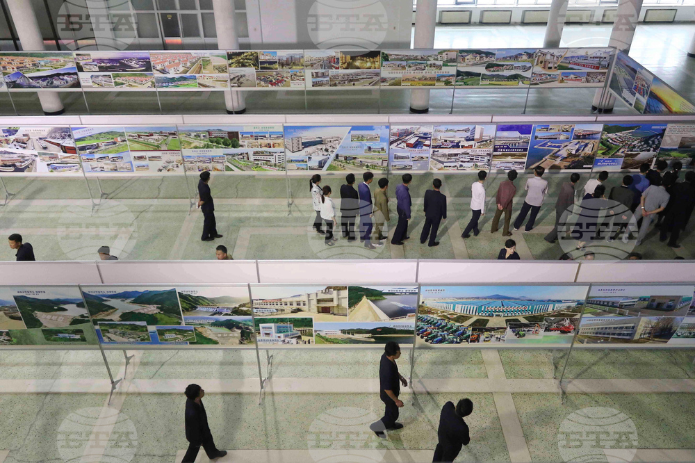 Pyongyang citizens look around the photo exhibition "Epochal entities of regional rejuvenation made in the great era of Kim Jong Un" in Pyongyang, North Korea Monday, Sept. 22, 2025. (AP Photo/Cha Song Ho)
