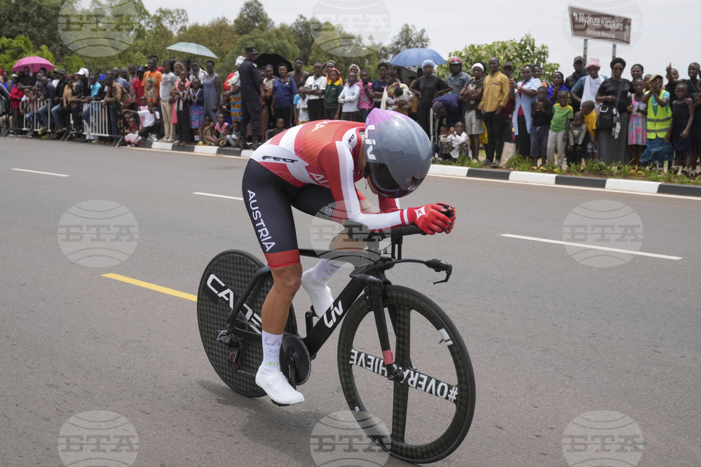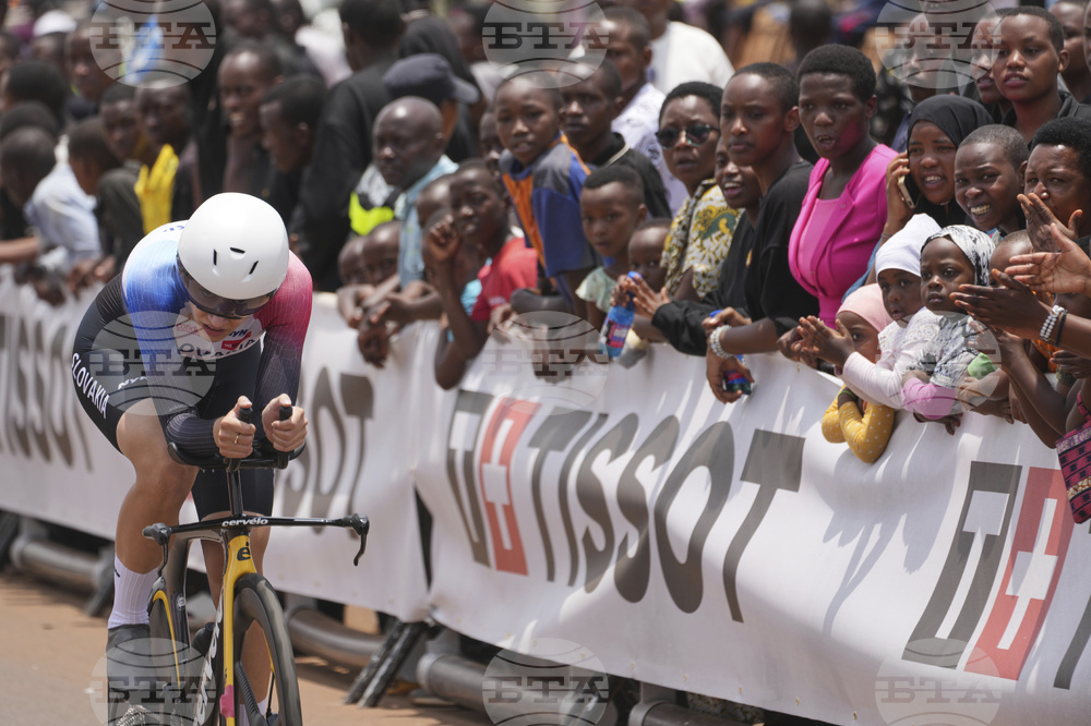 Slovakia's Matthias Schwarzbacher competes, during the men's Under 23 individual time trial event, at the road cycling World Championships in Kigali, Rwanda, Monday, Sept. 22, 2025. (AP Photo/Jerome Delay)