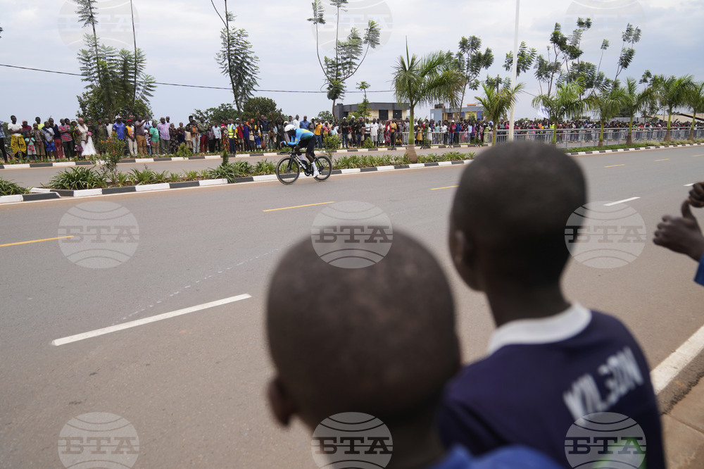 Spectators cheer as Rwanda's Etienne Tuyizere rides by during the men's Under 23 individual time trial event, at the road cycling World Championships in Kigali, Rwanda, Monday, Sept. 22, 2025. (AP Photo/Jerome Delay)