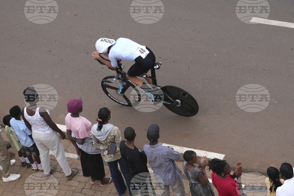 Benin's Vanette Houssou competes, during the women's Under 23 individual time trial event, at the road cycling World Championships in Kigali, Rwanda, Monday, Sept. 22, 2025. (AP Photo/Jerome Delay)