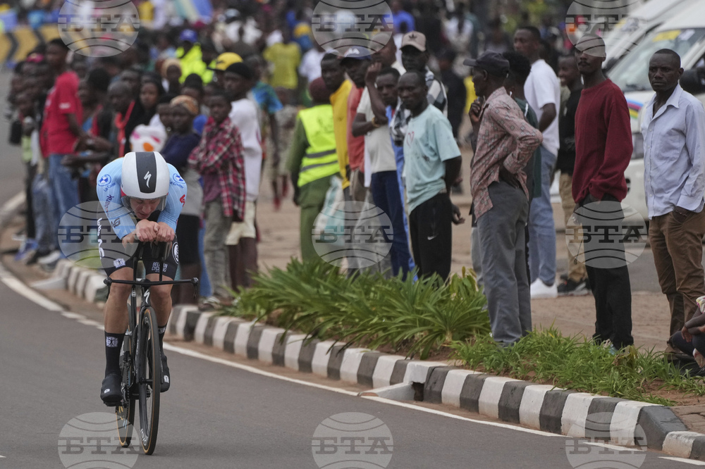 Andrei Belyanin competes, during the men's Under 23 individual time trial event, at the road cycling World Championships in Kigali, Rwanda, Monday, Sept. 22, 2025. (AP Photo/Jerome Delay)
