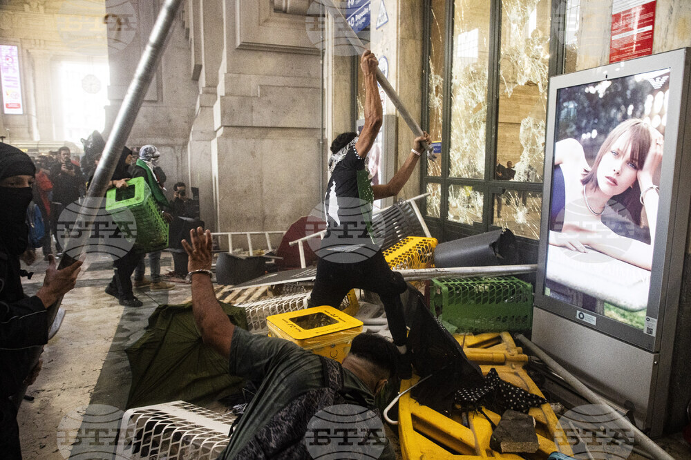 Protesters enter Central Station during clashes with police after the strike march in support of Palestine, in Milan, Italy, Monday, Sept. 22, 2025. (Marco Ottico/Lapresse via AP)