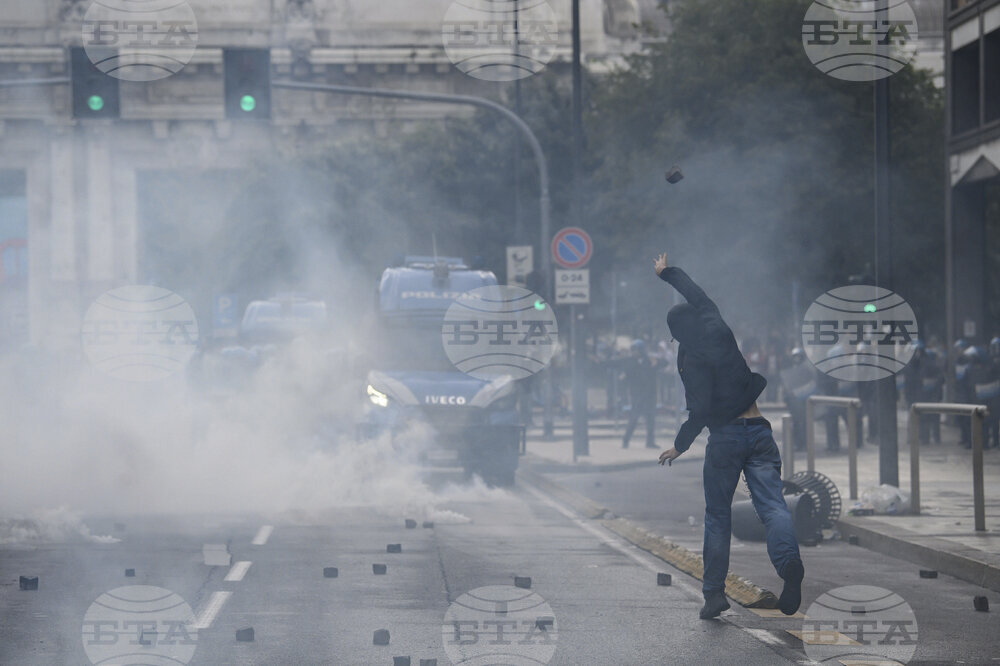 Protesters throw rocks during clashes with riot police as they participate in a demonstration part of a nation-wide protest and general strike against the war in Gaza, in Milan, Monday, Sept. 22, 2025. (Claudio Furlan/LaPresse via AP)