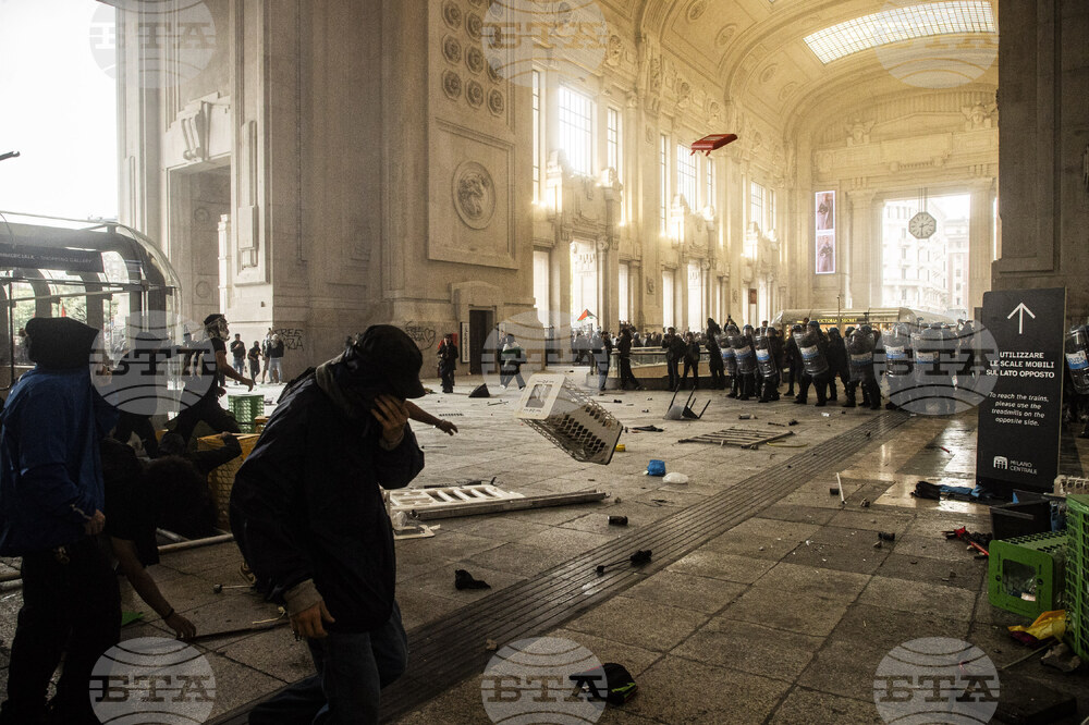 Protesters clash with riot police as they participate in a demonstration part of a nation-wide protest and general strike against the war in Gaza, at the central station in Milan, Monday, Sept. 22, 2025. (Marco Ottico/LaPresse via AP)