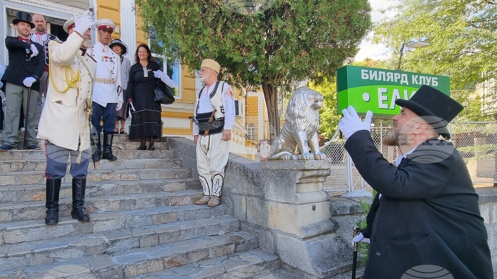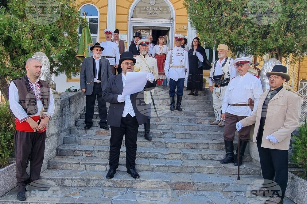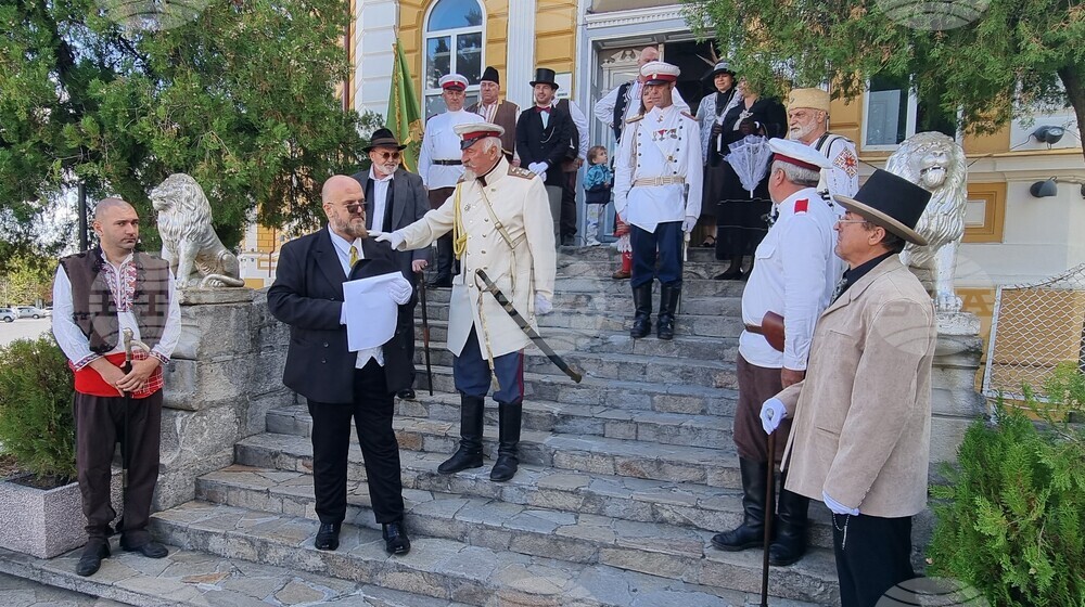Шумен (22 септември 2025) Членове на Родолюбивия комитет „Кан Крум Страшний“ в Шумен представят пред сградата на Военния клуб в града, възстановка посветена на 117 години от обявяването на Независимостта на България и пресъздаваща историческите събития от 22 септември 1908 г., когато българската държава окончателно отхвърля васалната си зависимост и заема равноправно място сред свободните европейски държави. На снимката: Бе пресъздаден и момента, в който в Шумен е получена телеграма, че княз Фердинанд обявява независимостта на България с манифест, прочетен пред събралите се десетки граждани от историка Явор Якимов (в средата), който е и директор на Профилираната езикова гимназия „Никола Вапцаров“ в града.