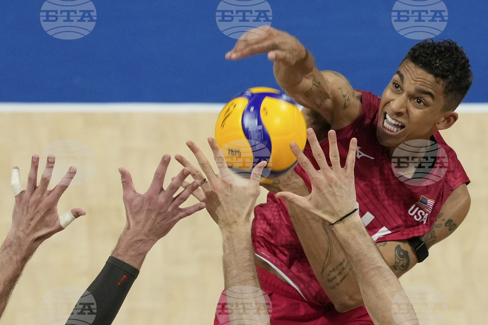 Nuno Marques of Portugal hits the ball against Preslav Petkov of Bulgaria during their round of 16 match at the 2025 FIVB Volleyball Men's World Championship at the Mall of Asia Arena, Pasay city, Philippines on Monday Sept. 22, 2025. (AP Photo/Aaron Favila)