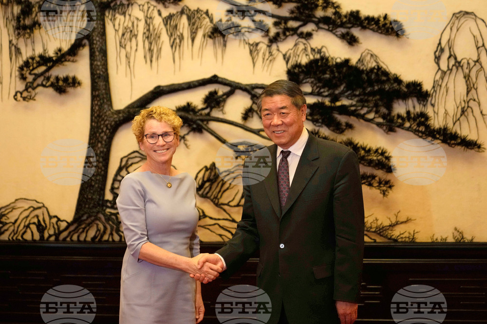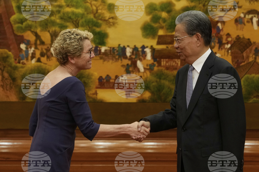 Chrissy Houlahan, D- Pennsylvania, House Armed Services Committee, left, poses for a photo with Chinese Vice Premier He Lifeng at the Great Hall of the People in Beijing, China, Monday, Sept. 22, 2025. (AP Photo/Mahesh Kumar A., Pool)