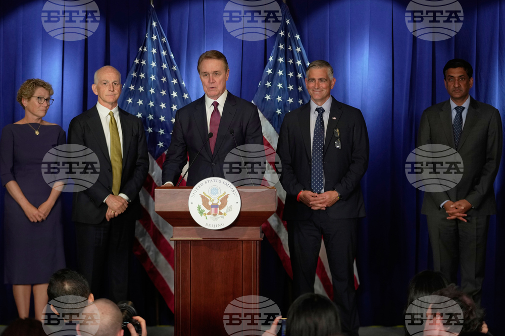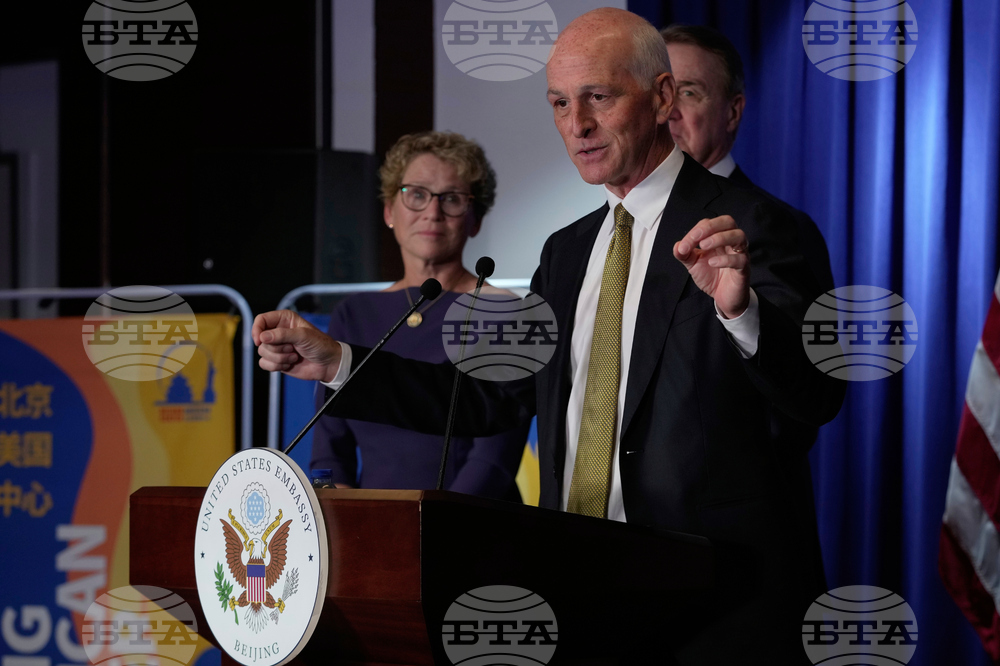 U.S. Ambassador to China David Perdue, center, speaks at a press conference with a bipartisan group of U.S. lawmakers from left, Chrissy Houlahan, Democratic member of House Armed Services Committee, U.S. Rep. Adam Smith, D-Wash, Michael Baumgartner, Republican member of House Foreign Affairs Committee, and Ro Khanna, Democratic member of House Armed Services Committee, at the U.S. Embassy in Beijing, China, Tuesday, Sept. 23, 2025. (AP Photo/Mahesh Kumar A.)