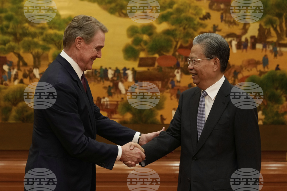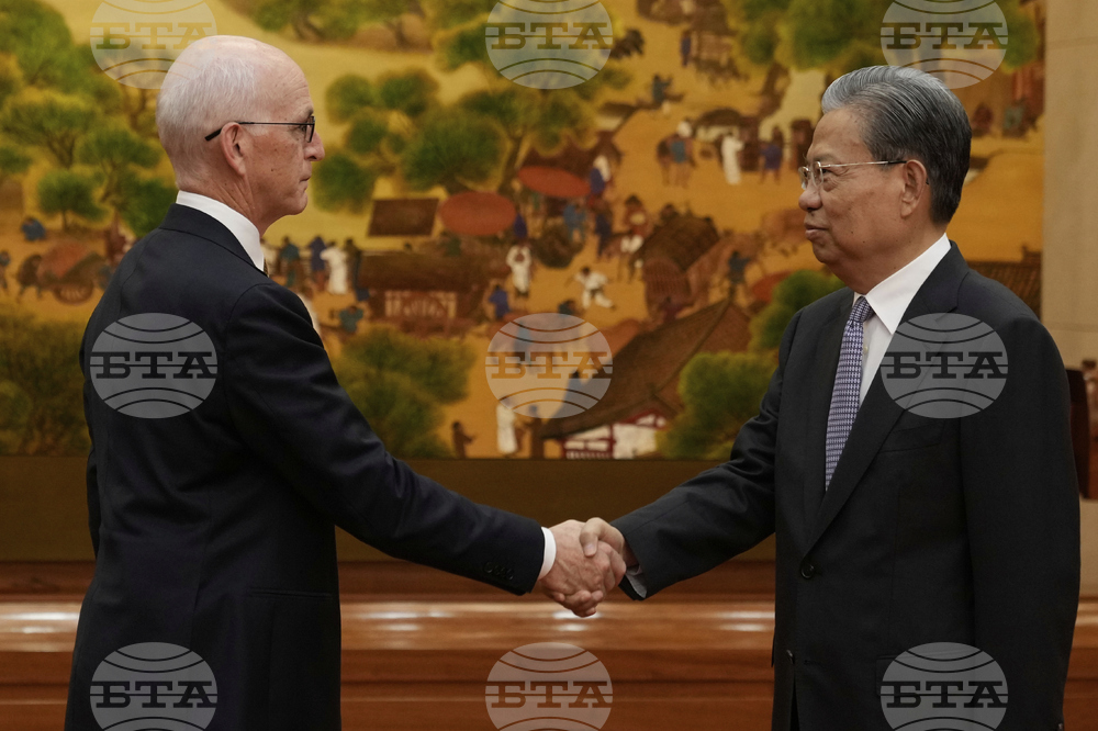 U.S. Ambassador to China David Perdue, left, shakes hands with Zhao Leji, Chairman of China's National People's Congress Standing Committee, at the Great Hall of the People in Beijing, China, Tuesday, Sept. 23, 2025. (AP Photo/Mahesh Kumar A., Pool)