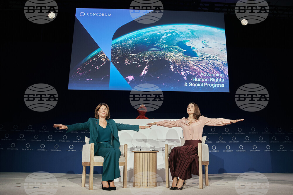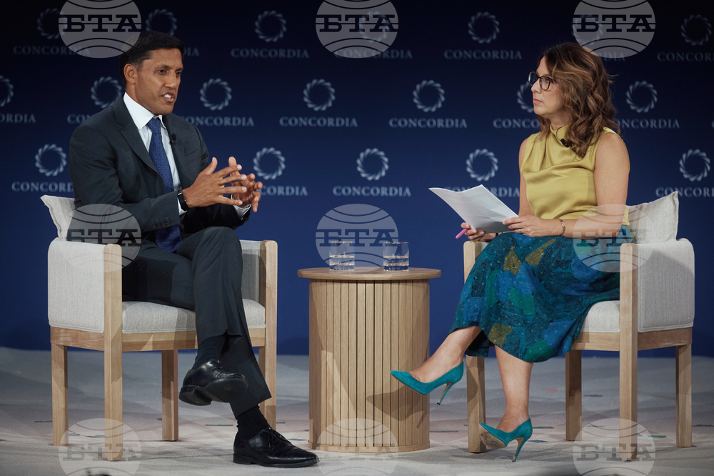 Rajiv Shah president of The Rockefeller Foundation, left, talks to Julie Hyman from Yahoo Finance, right, during the Concordia Annual Summit, in New York, Monday, Sept. 22, 2025. (AP Photo/Andres Kudacki)