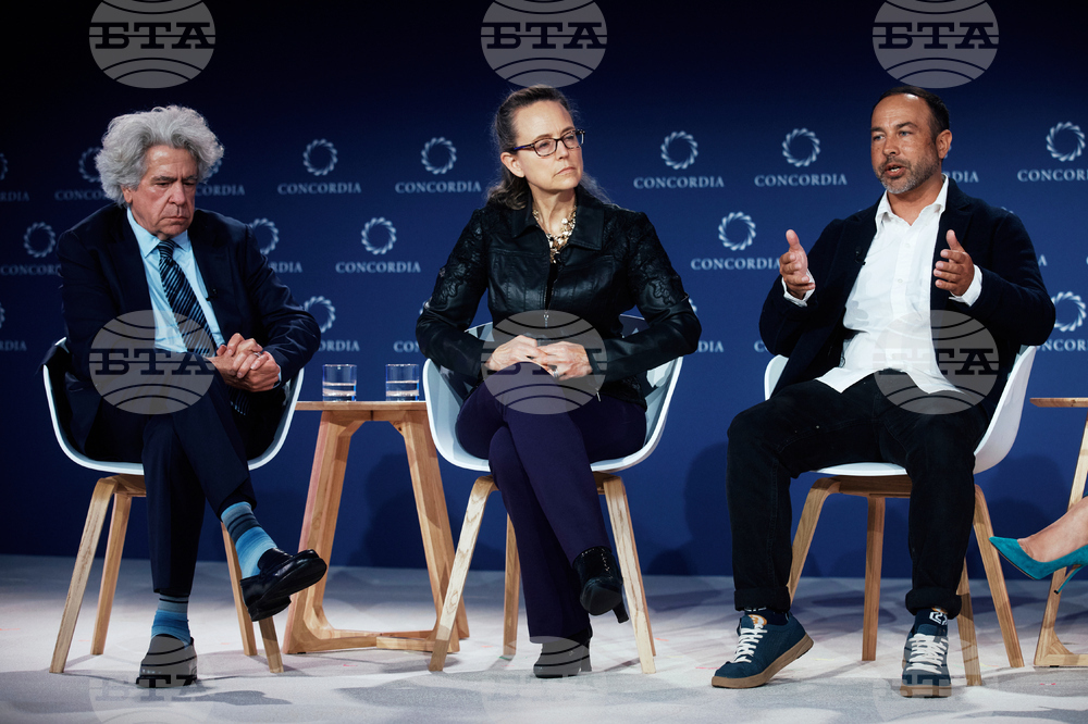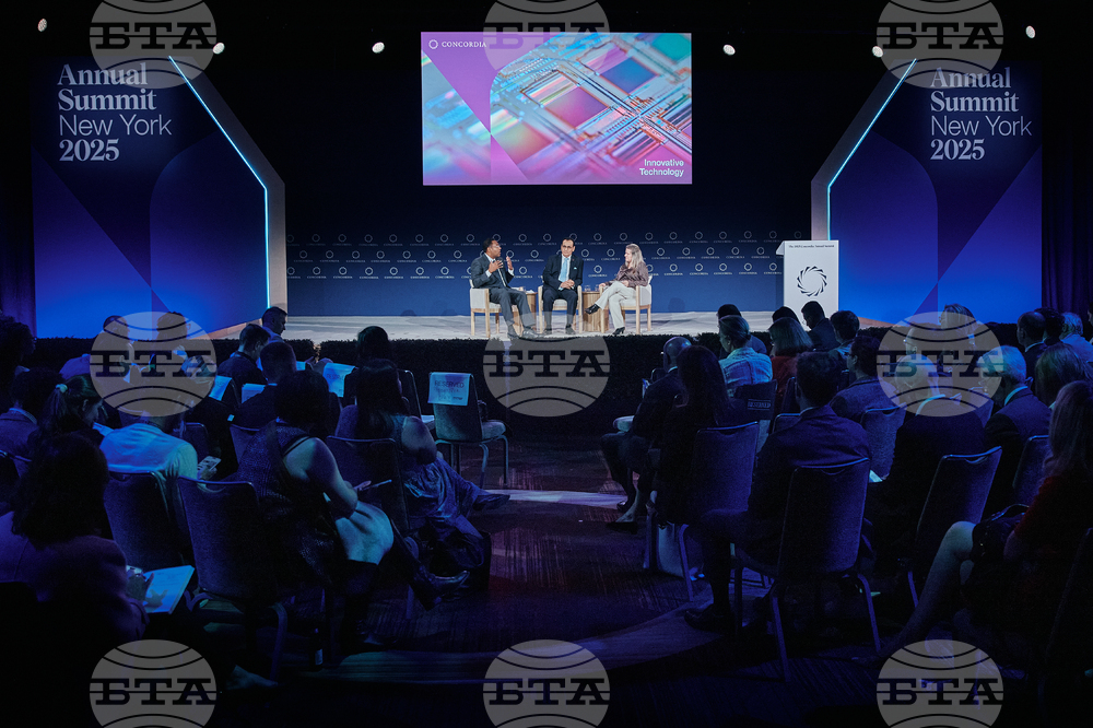 Sabastian Niles from Salesforce, left, speaks next to Nasser Alkahtani from the Arab Gulf Programme for Development (AGFUND), center, and Anna Gawel from Devex, right, during the Concordia Annual Summit in New York, Tuesday, Sept. 23, 2025. (AP Photo/Andres Kudacki)