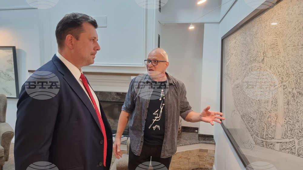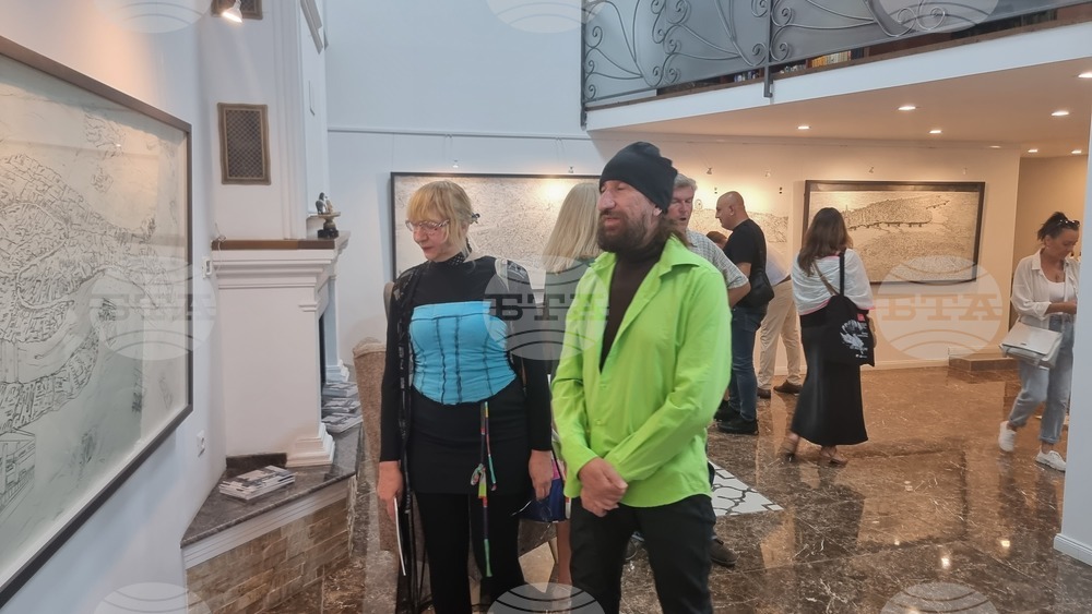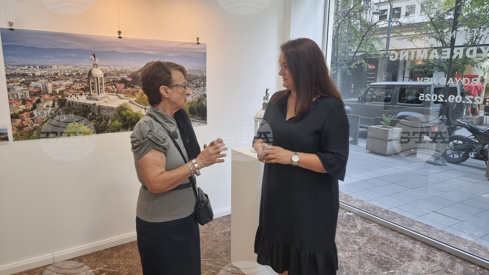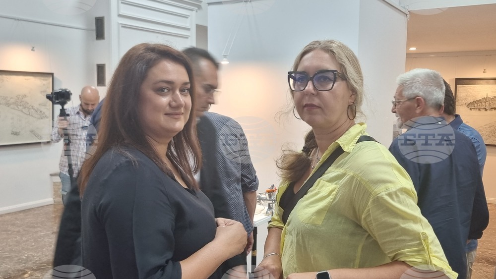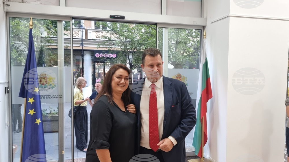 Скопие (22 септември 2025) В Българския Културно-Информационен център в Скопие се открива изложба на Лъчезар Бояджиев (вдясно) озаглавена „Градско Бленуване". На събитието присъства кореспондента на БТА в Скопие Маринела Величкова (в средата).