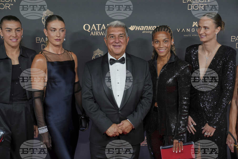 Joan Laporta, center, Raphinha and Lamine Yamal, right, arrive for the 69th Ballon d'Or (Golden Ball) award ceremony at Theatre du Chatelet in Paris, Monday, Sept. 22, 2025. (AP Photo/Thibault Camus)