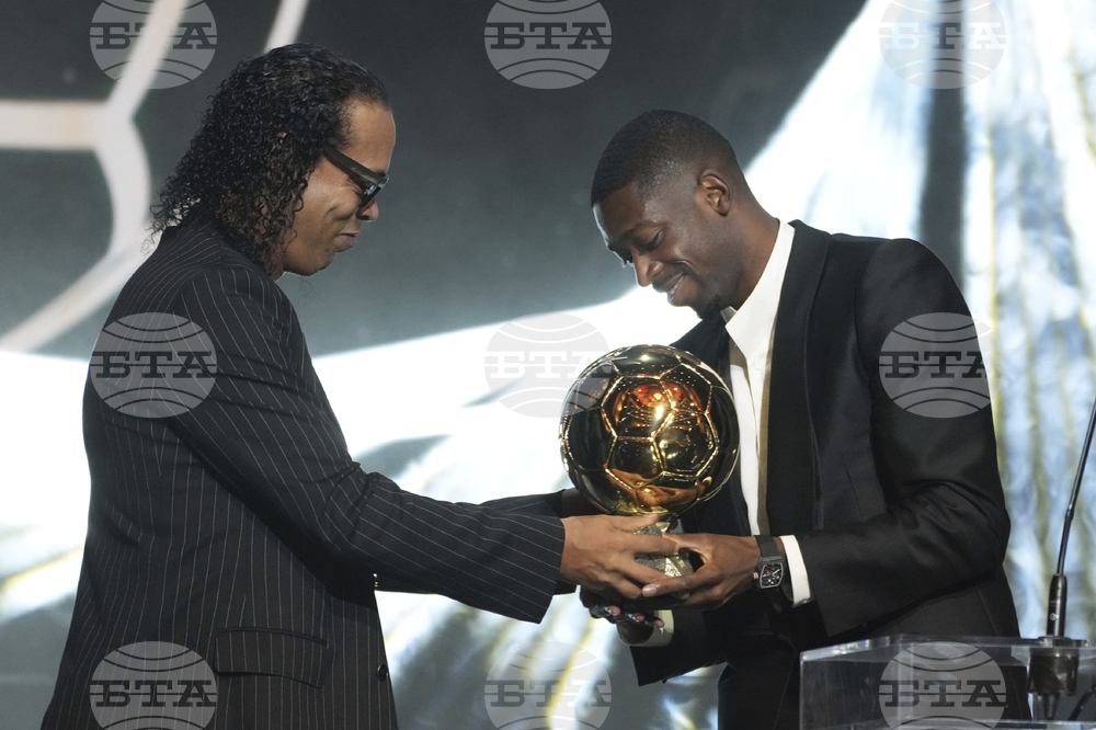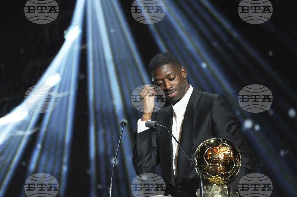 Paris Saint-Germain's Ousmane Dembélé receives the 2025 Men's Ballon d'Or during the 69th Ballon d'Or awards ceremony at the Theatre du Chatelet in Paris, Monday, Sept. 22, 2025. (AP Photo/Thibault Camus)