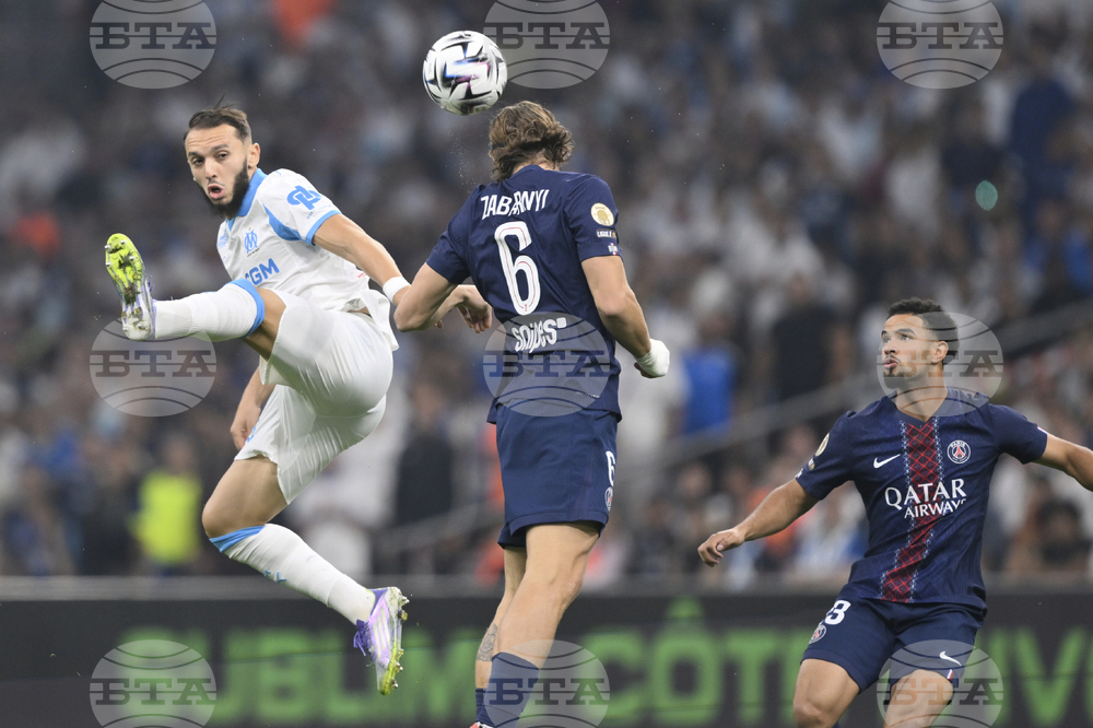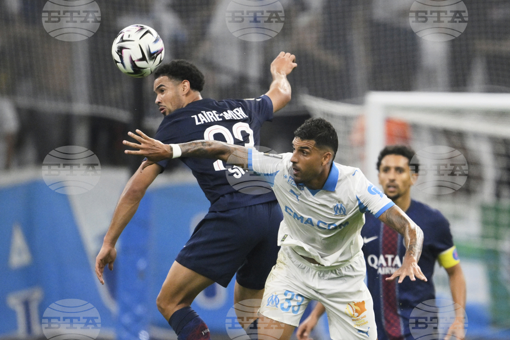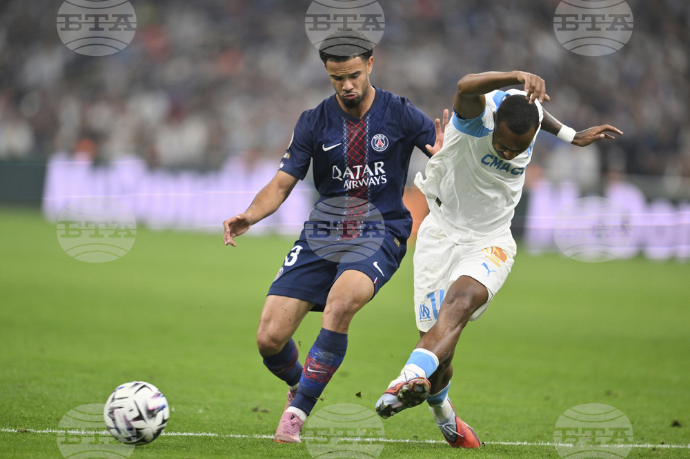 Marseille's Amine Gouiri, left, challenges for the ball with PSG's Illya Zabarnyi during the French League One soccer match between Marseille and Paris Saint-Germain at Orange Velodrome in Marseille, France, Monday, Sept. 22, 2025. (AP Photo/Philippe Magoni)
