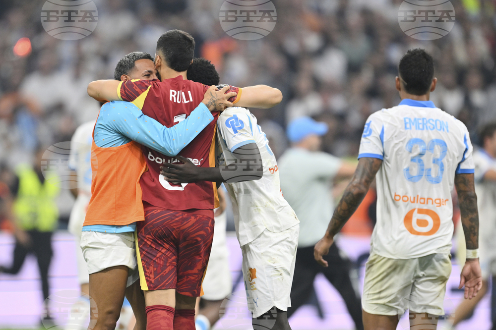 Marseille's head coach Roberto De Zerbi, centre, Marseille's Pierre-Emile Hojbjerg, left, Marseille's Matt O'Riley celebrate their victory after the French League One soccer match between Marseille and Paris Saint-Germain at Orange Velodrome in Marseille, France, Monday, Sept. 22, 2025. (AP Photo/Philippe Magoni)