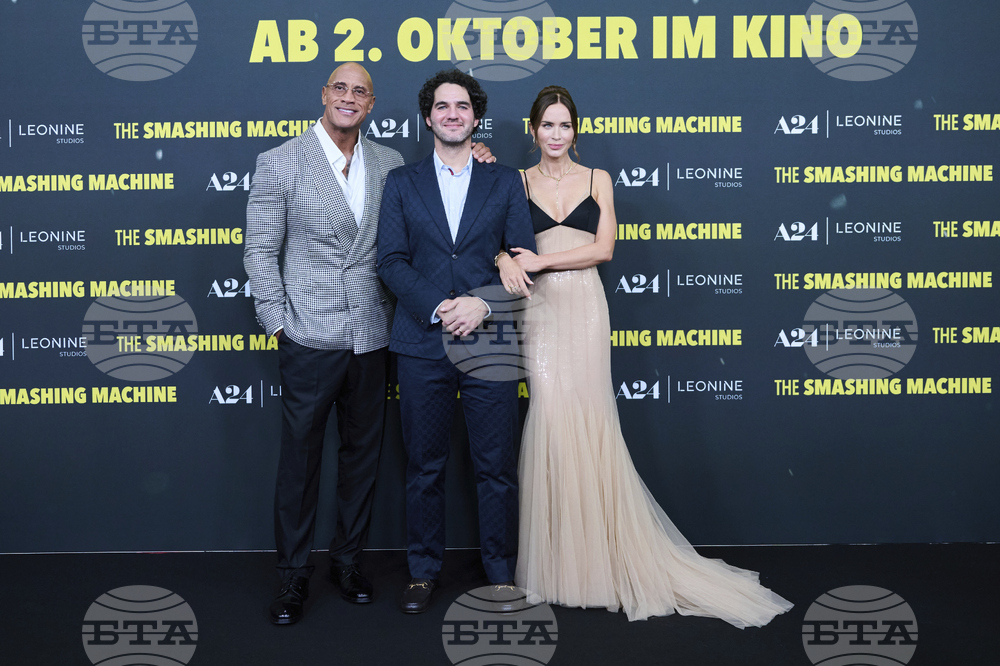 Dwayne Johnson, from left, director Benny Safdie, and Emily Blunt attend the German premiere of "The smashing machine" at the Zoo Palast in Berlin, Germany, Monday, Sept. 22, 2025. (Annette Riedl/dpa via AP)