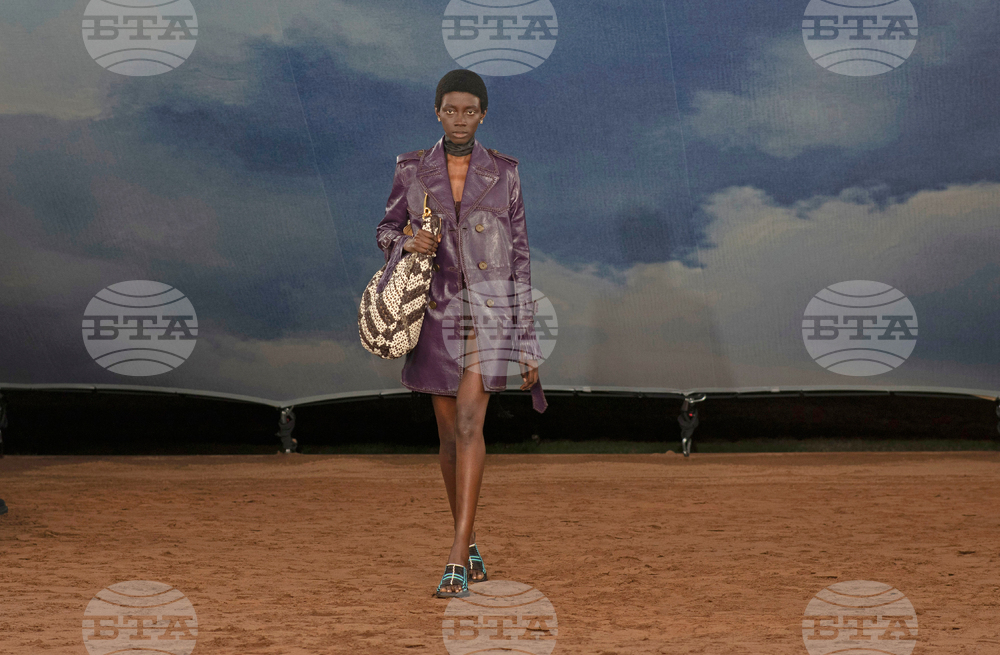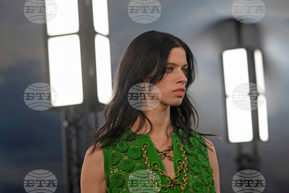 Shqui Lan on the catwalk at the Burberry show in Perks Field, Kensington Gardens, in London, during London Fashion Week, Monday, Sept. 22, 2025. (Jeff Moore/PA via AP)
