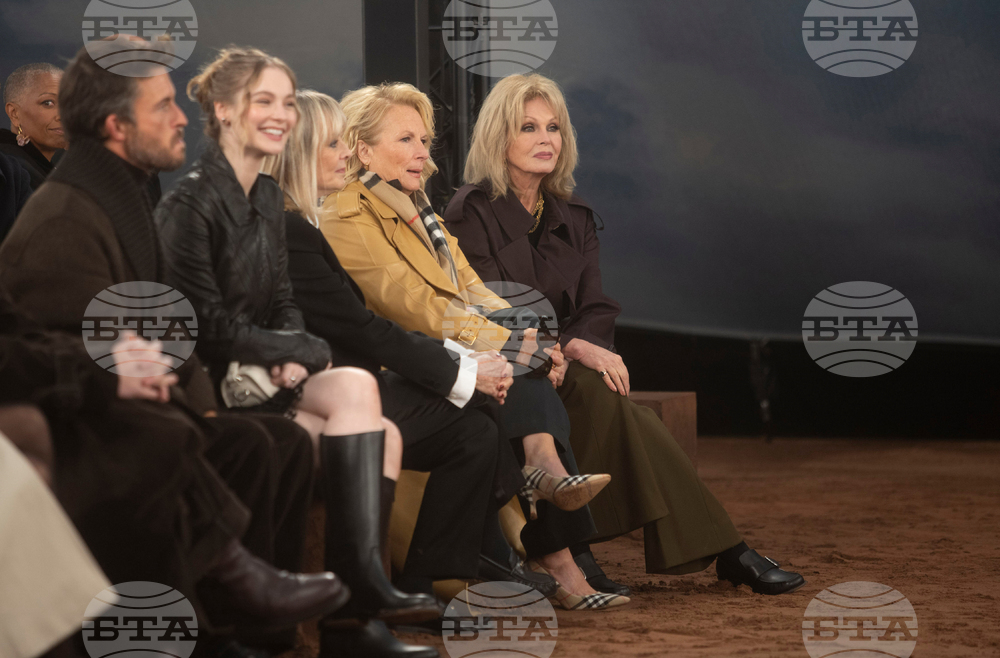 Jonathan Bailey, from left, Hannah Dodd, Twiggy, Jennifer Saunders and Joanna Lumley attend the Burberry show in Perks Field, Kensington Gardens, in London, during London Fashion Week, Monday, Sept. 22, 2025. (Jeff Moore/PA via AP)