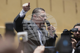 FILE - Costa Rican President Rodrigo Chaves speaks to supporters after addressing a legislative committee considering a request from the Supreme Court to lift his immunity so he can stand trial on corruption charges in San Jose, Costa Rica, Aug. 22, 2025. (AP Photo/Jose Diaz, File)