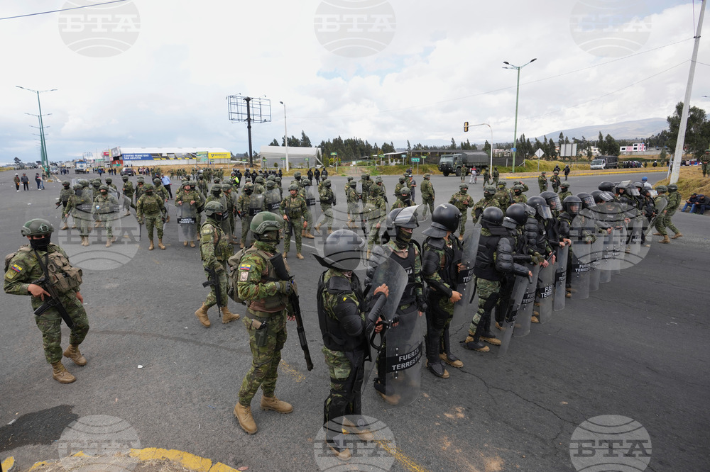 Soldiers stand guard on a highway during an anti-government protest in Latacunga, Ecuador, Monday, Sept. 22, 2025. (AP Photo/Dolores Ochoa)