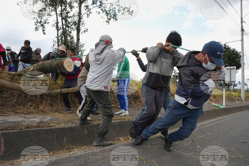 Community members move tree branches onto the Pan-American Highway to protest the government, in Otavalo, Ecuador, Monday, Sept. 22, 2025. (AP Photo/Carlos Noriega)