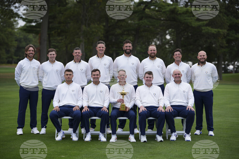 Members of the 2025 European Ryder Cup team pose for a group photo before a practice round for the Ryder Cup golf tournament, Tuesday, Sept. 23, 2025, in Farmingdale, N.Y., at Bethpage State Park's Black Course. (AP Photo/Robert Bukaty)
