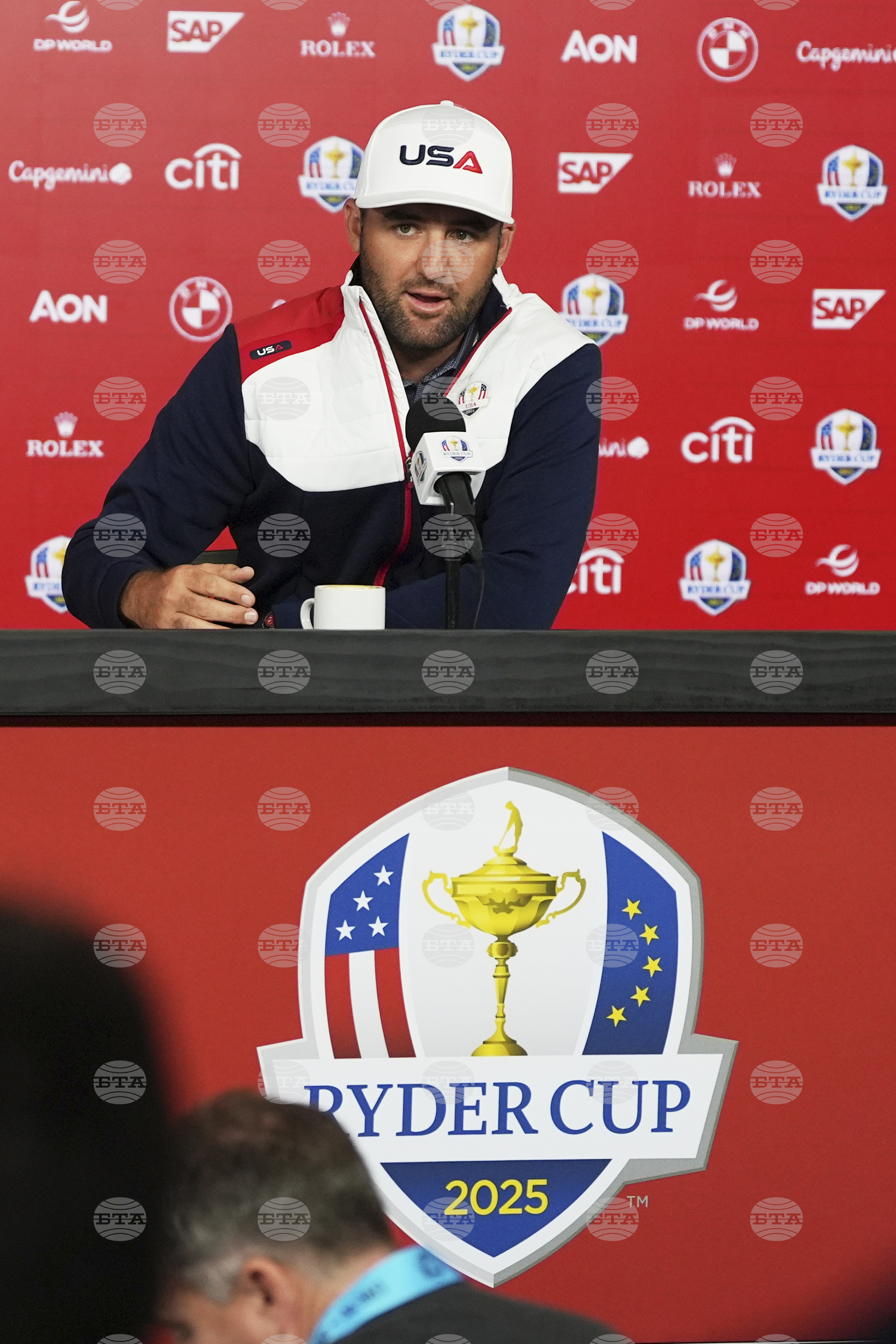 United States' Scottie Scheffler arrives for a news conference before a practice round at the Ryder Cup golf tournament, Tuesday, Sept. 23, 2025, in Farmingdale, N.Y., at Bethpage State Park's Black Course between the United States and Europe. (AP Photo/Lindsey Wasson)