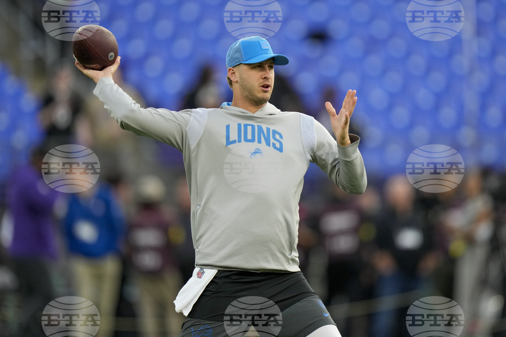 Detroit Lions quarterback Jared Goff works out prior to an NFL football game against the Baltimore Ravens Monday, Sept. 22, 2025, in Baltimore. (AP Photo/Stephanie Scarbrough)