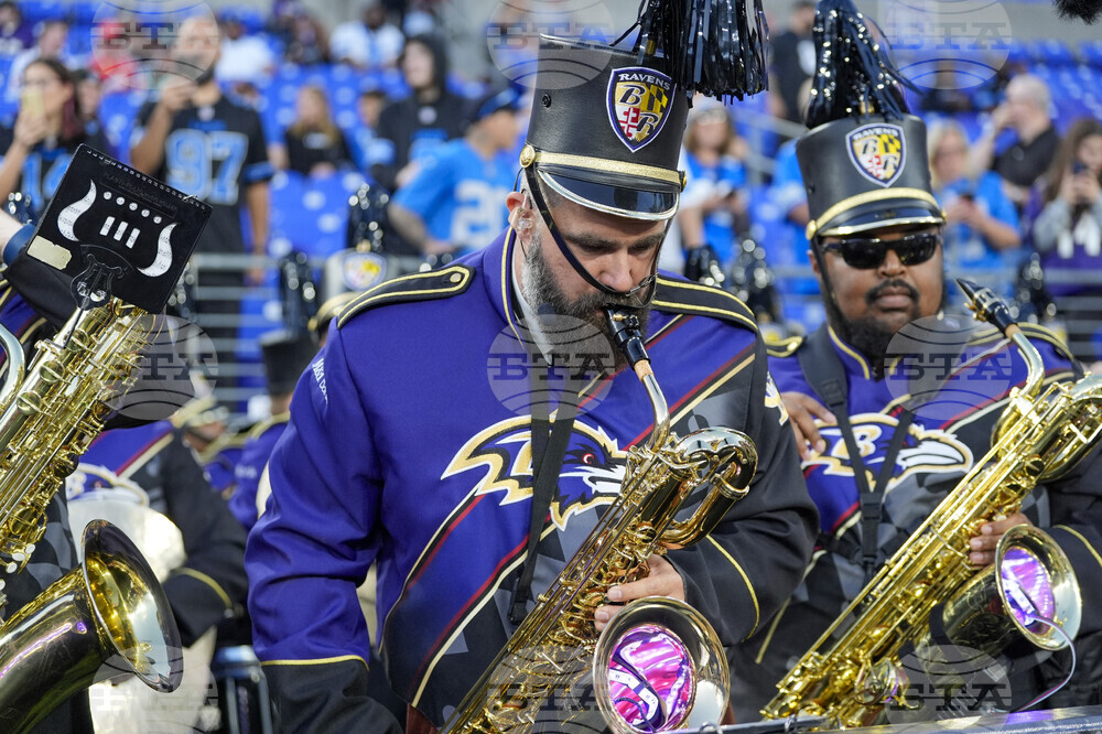 Former Philadelphia Eagles player Jason Kelce participates with the Marching Ravens prior to an NFL football game between the Baltimore Ravens and the Detroit Lions Monday, Sept. 22, 2025, in Baltimore. (AP Photo/Stephanie Scarbrough)