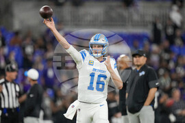 Detroit Lions quarterback Jared Goff throws a pass against the Baltimore Ravens during the first half of an NFL football game Monday, Sept. 22, 2025, in Baltimore. (AP Photo/Nick Wass)
